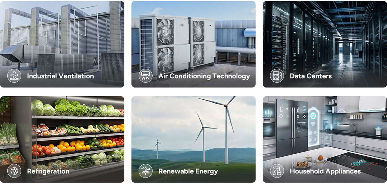 Applications typiques : Unités de traitement d'air (UTA), stockage frigorifique, systèmes CVC commerciaux, ventilation agricole, pompes à chaleur.